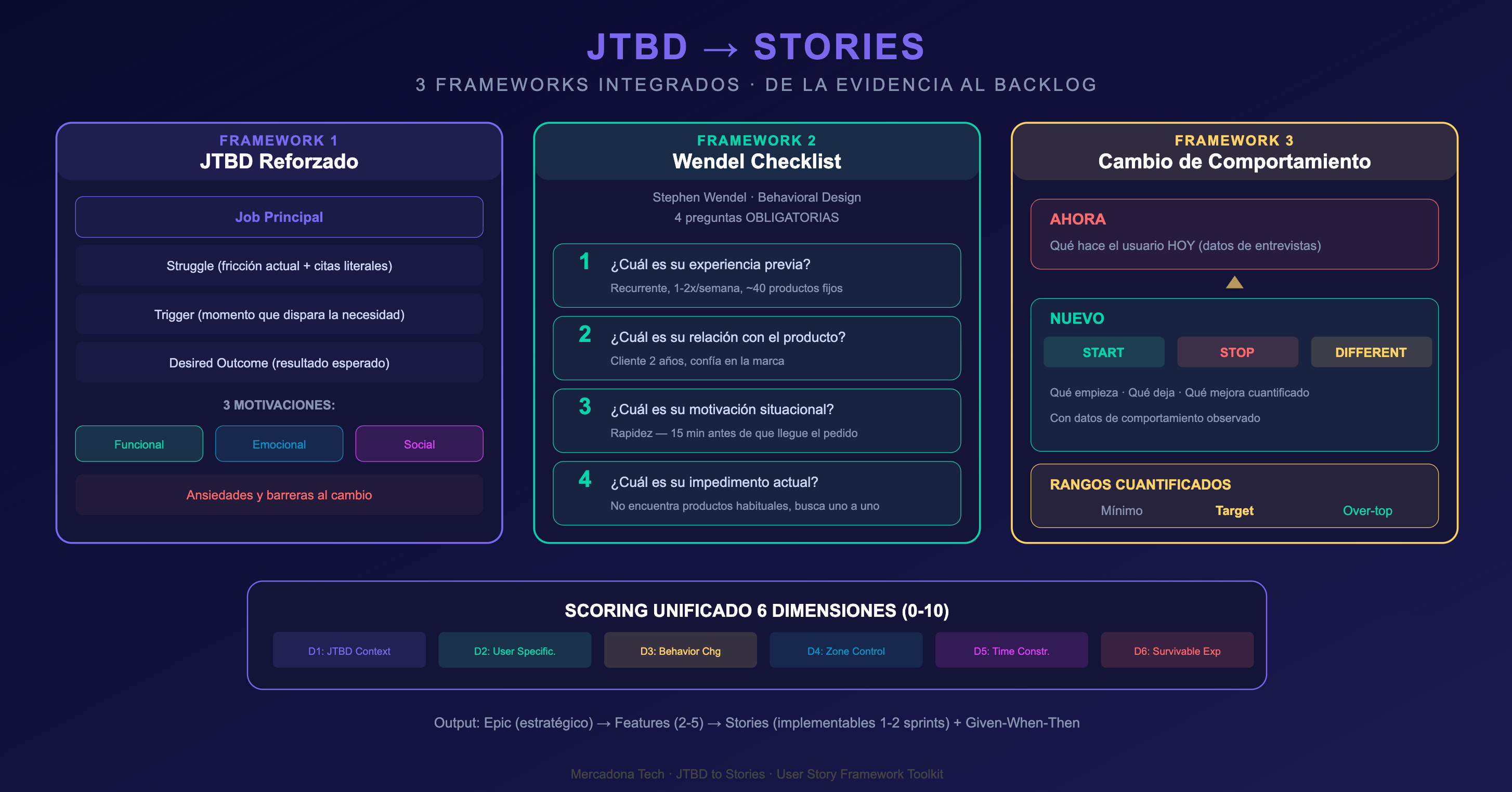 Serie Gemba: AI Mercadona User Story Framework — Tres marcos integrados para traducir research en stories implementables