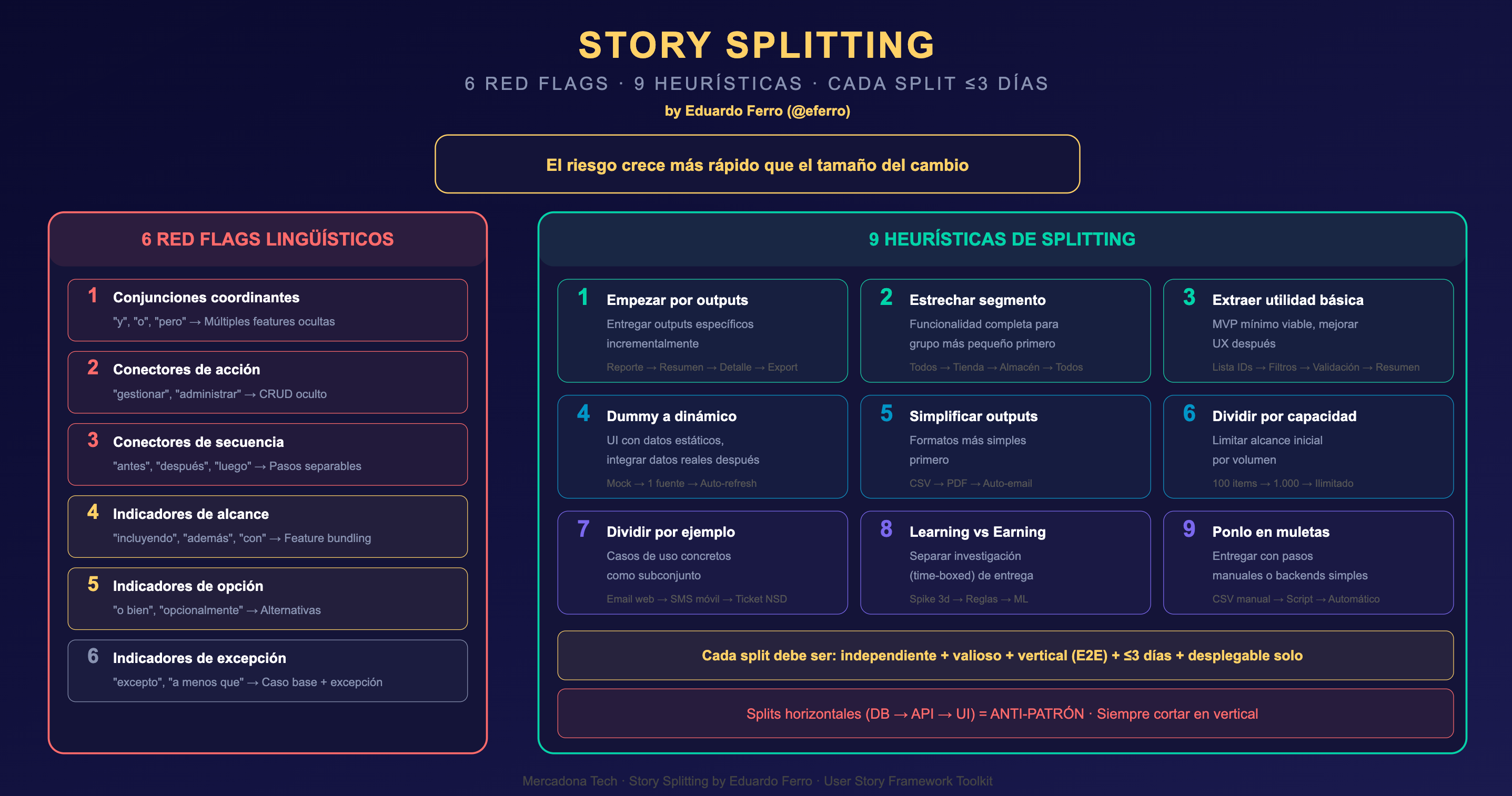 El framework de Eduardo automatiza el proceso de identificar dónde el riesgo está oculto —en el lenguaje de las historias que escribimos—, y proporciona un conjunto sistemático de heurísticas para transformar esas historias en incrementos seguros y valiosos.